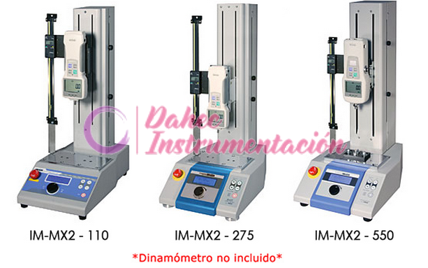 El MX-110 y el MX-275 aceptan cualquiera de los calibradores de fuerza estándar Imada. MX-1100 acepta cualquier calibrador de fuerza Imada de alta capacidad. Temporizador opcional y medidor de distancia digital disponible.